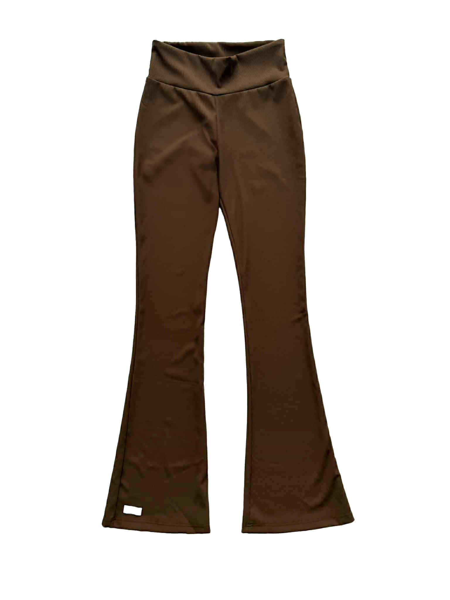 Brązowe legginsy dzwony z wysokim stanem i rozszerzanymi nogawkami uszte z modelującej,prążkowanej dzianiny.